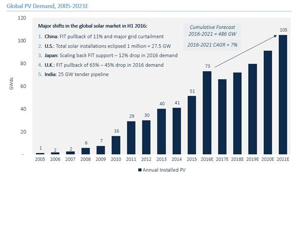 根據(jù)GTM最新發(fā)布的太陽(yáng)能需求監(jiān)測(cè)報(bào)告來看,2016年,全球新增太陽(yáng)能裝機(jī)容量將比去年增長(zhǎng)43%,達(dá)到73吉瓦。